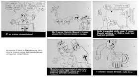 Il rullino dal quale sono tratte queste diapositive fa parte di una serie di pellicole conservate alla Biblioteca Comunale di Marradi, preparate dal PCI (Partito Comunista Italiano) per la propaganda elettorale del 1953. Non si sa perché siano a Marradi, probabilmente un anonimo propagandista le dimenticò qui da noi dopo averle proiettate in paese e nelle frazioni. Sono fotogrammi su pellicola di celluloide, in bianco e nero, da proiettare su un muro con una apposita macchinetta. Un proiettore di questo tipo non si trova più, però la tecnologia giapponese ha permesso di trasformare le diapositive in files jpg che poi, raggruppate, hanno dato il risultato che potete vedere.